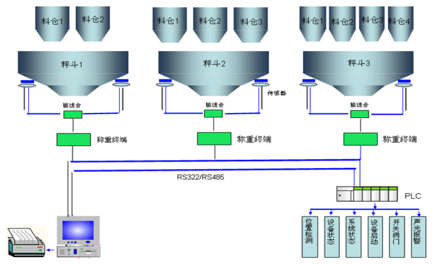 自动化称重控制计量系统由双层称台、称重模组、接线盒、称重控制仪表、距离开关装置、料仓预位装置、数据传输服务器、上位机操作软件、PLC主机组成。可按照料斗存储量大小来调节单磅过称重量,过称期间无需停机停顿,实现全自动称重,上下双层称台结构,下秤斗为称重斗,上秤斗为缓存斗,通过距离开关和PLC来控制舱门预位状态,实现称重和缓存完美切换,称重完成可直接由传送带输送至下一环节,解决运输损耗和劳动力消耗,降低成本的同时,大幅度提高生产效率,直接的提升每天的收购量。